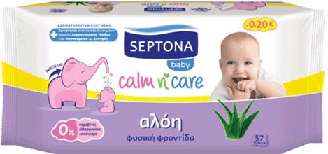 Τα απαλά μωρομάντηλα Septona Calm n' Care Aloe Vera είναι ιδανικά για την καθημερινή περιποίηση της ευαίσθητης βρεφικής επιδερμίδας, από την 1η μέρα. Η αγνή σύνθεσή τους με εκχύλισμα aloe vera και βιταμίνη Ε, καθαρίζει απαλά το δερματάκι του μωρού σας, αφήνοντας ταυτόχρονα απαλό άρωμα και αίσθηση δροσιάς. Έχουν φυσικό pH 5,5, είναι δερματολογικά ελεγμένα, με 0% parabens, χωρίς αλλεργιογόνα ,οινόπνευμα,σαπούνι, προπυλενογλυκόλη και ισοθειαζολινόνες