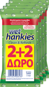 Τα Wet Hankies με άρωμα λεμόνι είναι αλκοολούχα αντιβακτηριδιακά μαντήλια με αιθυλική αλκοόλη (οινόπνευμα) και επιπλέον αντισηπτικό παράγοντα. Με άρωμα φρεσκάδας λεμονιού. Εξουδετερώνουν τα μικρόβια, ενώ έχουν άριστη δράση κατά του ιού Η1Ν1. Με αποδεδειγμένη απολυμαντική δράση βάσει των Ευρωπαϊκών Προτύπων ΕΝ 1650, ΕΝ 1276, ΕΝ 1040, ΕΝ 14476, ΕΝ 1499.