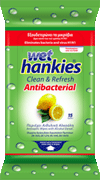 Τα Wet Hankies με άρωμα λεμόνι είναι αλκοολούχα αντιβακτηριδιακά μαντήλια με αιθυλική αλκοόλη (οινόπνευμα) και επιπλέον αντισηπτικό παράγοντα. Με άρωμα φρεσκάδας λεμονιού. Εξουδετερώνουν τα μικρόβια, ενώ έχουν άριστη δράση κατά του ιού Η1Ν1. Με αποδεδειγμένη απολυμαντική δράση βάσει των Ευρωπαϊκών Προτύπων ΕΝ 1650, ΕΝ 1276, ΕΝ 1040, ΕΝ 14476, ΕΝ 1499. Σε συσκευασία των15τεμαχίων.