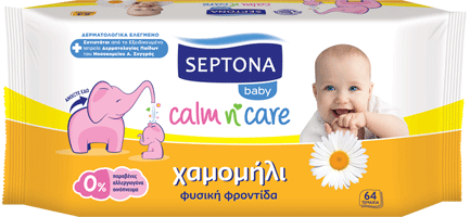 Τα απαλά μωρομάντηλα Septona Calm n Care χαμομήλι είναι ιδανικά για την καθημερινή περιποίηση της ευαίσθητης βρεφικής επιδερμίδας, από την 1η μέρα. Η αγνή σύνθεσή τους με υδατικό απόσταγμα χαμομηλιού και βιταμίνη Ε καθαρίζει απαλά το δερματάκι του μωρού προσφέροντας φυσική φροντίδα και αίσθηση φρεσκάδας. Φυσικό pH 5,5. Δερματολογικά ελεγμένα. 0% παραβένες, αλλεργιογόνα, οινόπνευμα, σαπούνι, προπυλενογλυκόλη, ισοθειαζολινόνες.