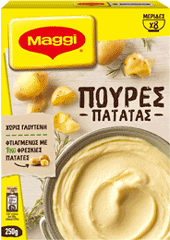 Η εταιρεία Maggi ιδρύθηκε στην Σουηδία to 1884 από τον Julius Maggi o οποίος ανέλαβε τον μύλο του πατέρα του από τότε μεχρί σήμερα συνεχίζει να πρωτοπορεί με νέα καινοτόμα προϊόντα. Η πατάτα περιέχει από τη φύση της άμυλο, μια σύνθετη μορφή υδατάνθρακα που απορροφάται αργά στον οργανισμό, μας δίνει ενέργεια και μας κρατά χορτάτους για περισσότερη ώρα. Ο Πουρές Πατάτας Maggi φτιαχνεται από εκλεκτές πατάτες, ψημένες και κομμένες σε νιφάδες ενώ για την συσκευασία των 250γρ χρησιμοποιούνται 1 κιλό πατάτες.Κατά την παραγωγή δεν χρησιμοποιούνται συντηρητικά ή χρωστικές ενώ αποτελεί πηγή φυτικών ινών και είναι χαμηλός σε λιπαρά. Καταναλώστε τον σαν συνοδευτικό σε ένα κυρίως γεύμα, σαν ένα ελαφρύ γεύμα ή ακόμα και σαν συστατικό παναρίσματος.